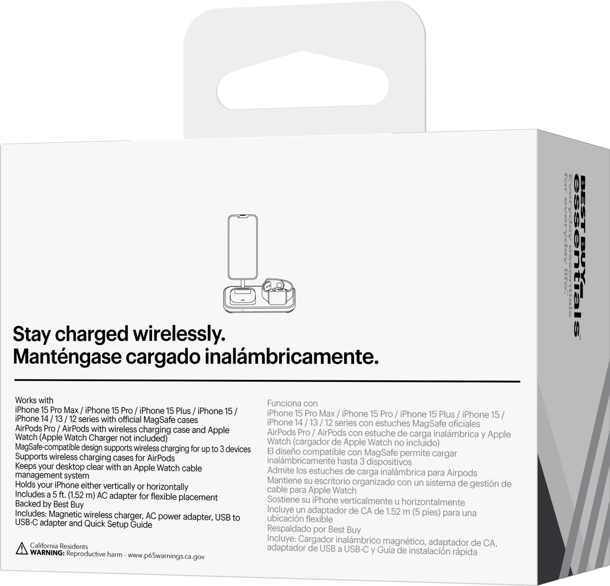The Best Buy essentials 3-in-1 Magnetic Wireless Charger is designed to simplify your charging routine by supporting multiple Apple devices simultaneously. It delivers a total output of 17.5W, with up to 7.5W for your iPhone, 5W for your Apple Watch, and 5W for your AirPods or other compatible devices. The charger features a robust magnetic design that securely holds your iPhone in place for optimal charging efficiency. It includes a USB to USB-C adapter to ensure compatibility with all Apple Watch models and a 5 ft. power adapter for versatile placement. Built with a cable management system and an LED indicator, this charger keeps your space tidy and informs you when it’s active.