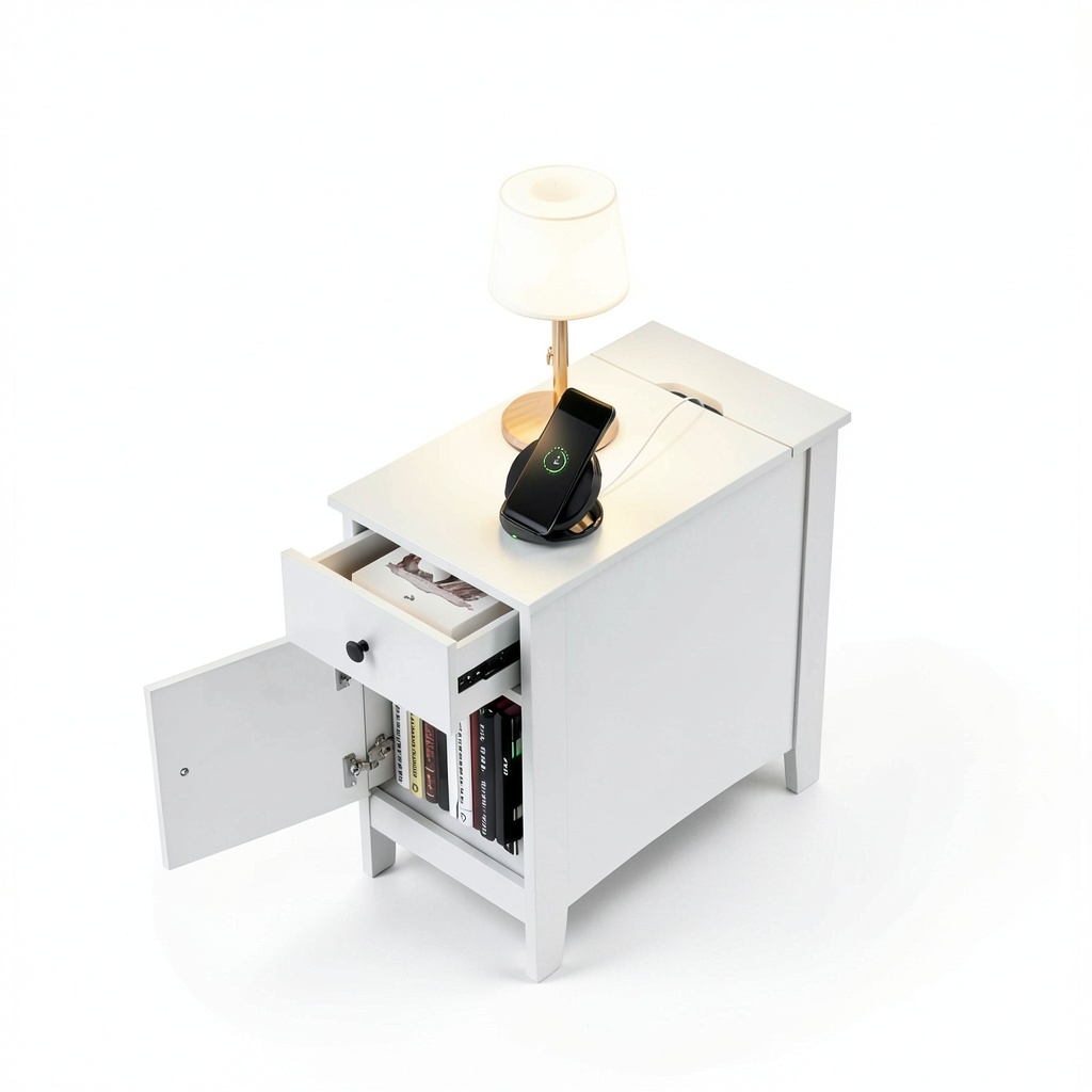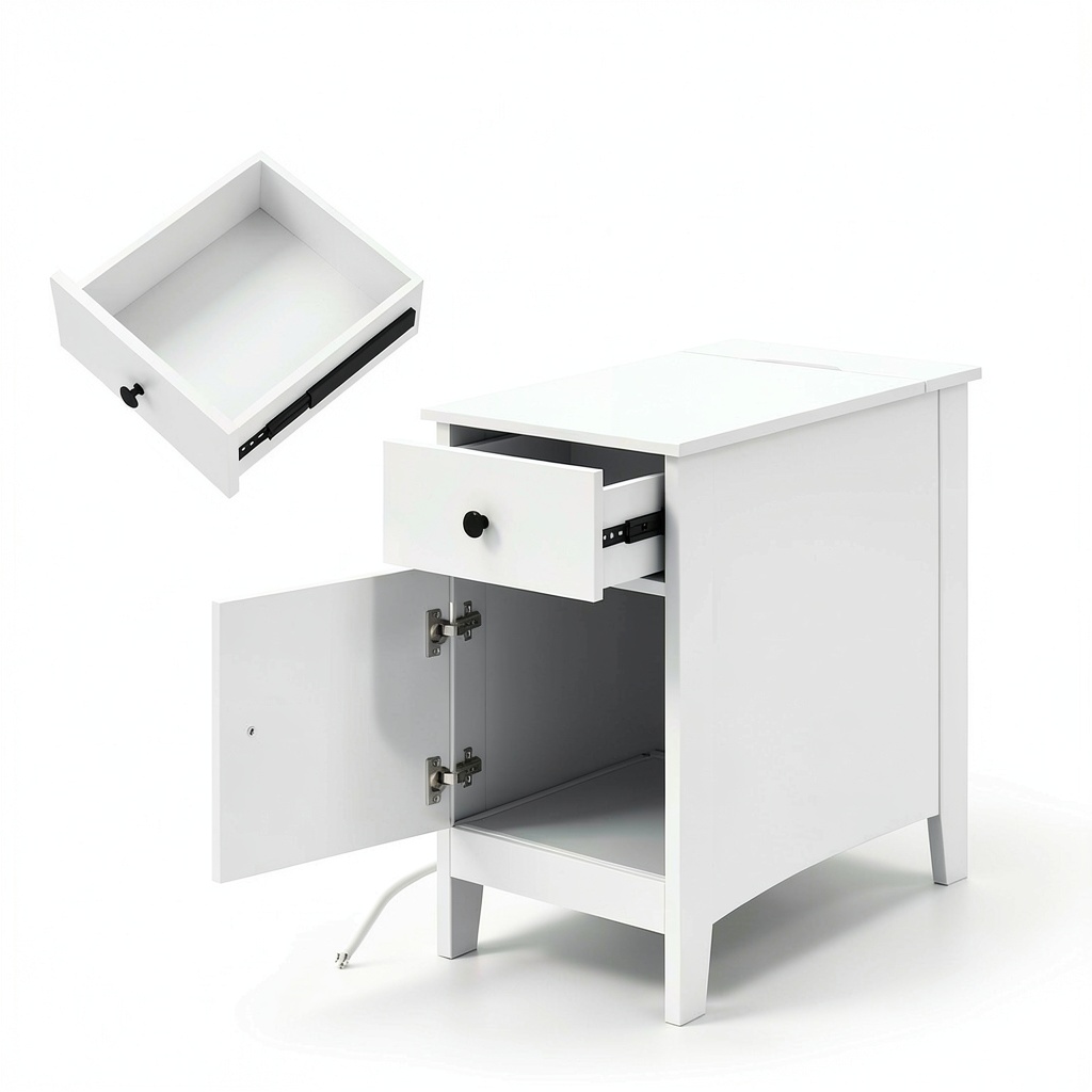 This bedside table is ideal for use in bedrooms, living rooms, or any area where convenient charging and storage are needed. It serves as a practical nightstand for keeping phones, tablets, and other devices powered overnight, while the drawer and cabinet store items like books, remotes, or personal belongings. The magazine rack is perfect for organizing reading materials, and the tabletop offers display space for lamps or decor. Target audiences include homeowners, apartment dwellers, and students seeking a multifunctional furniture piece that reduces clutter and enhances daily convenience. Its compact size allows it to fit seamlessly beside beds, sofas, or in corners, making it a smart addition to any room.
