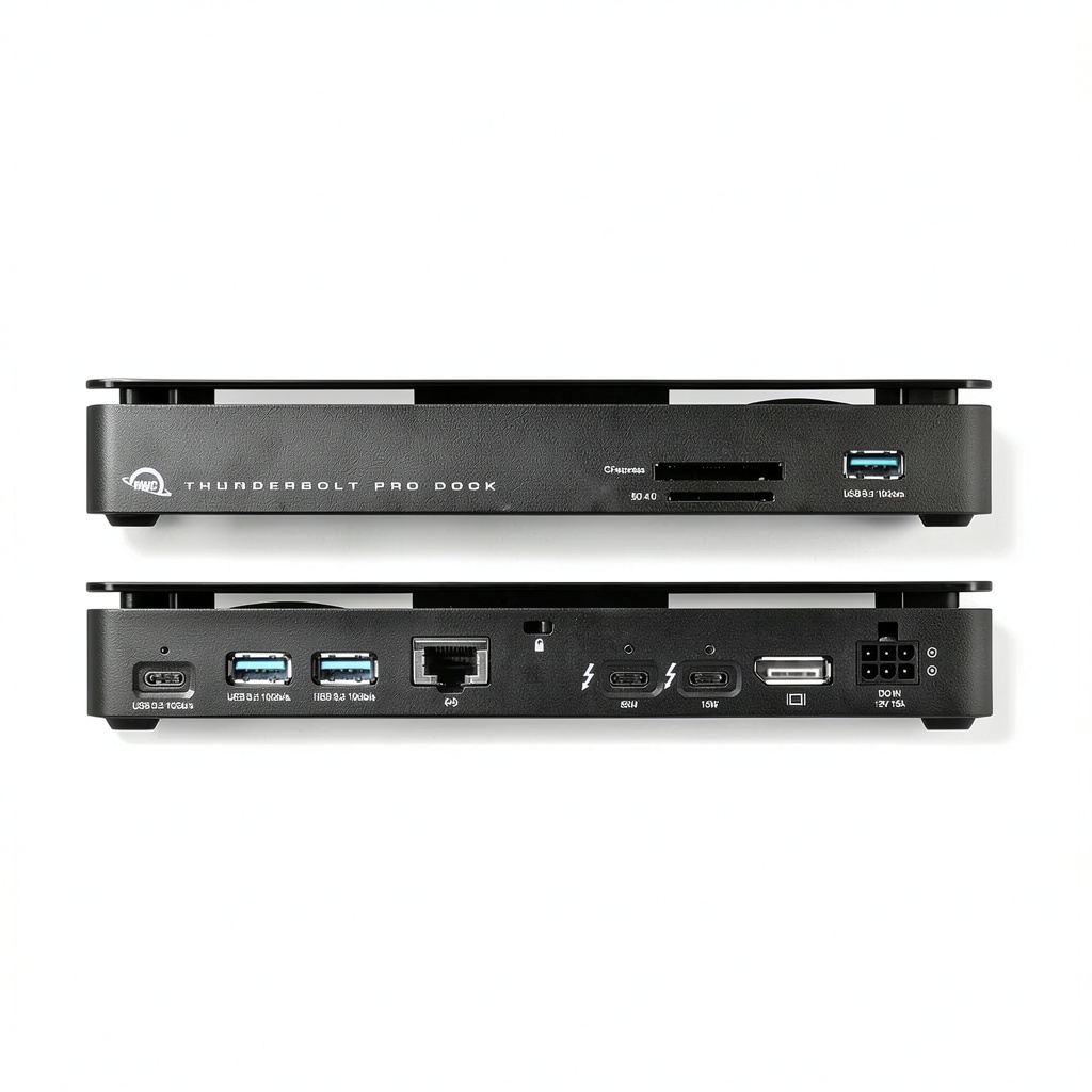 OWC Thunderbolt Pro Dock stands out with its unrivaled combination of super-fast 10Gb Ethernet and high-speed card readers, optimized for production workflows. It offers a unique configuration that enhances productivity by supporting raw file ingestion and collaborative environments without bottlenecks. The dock is backed by a 2-year OWC limited warranty, emphasizing durability and quality assurance. Its competitive edge lies in the precise engineering for pro audio and video synchronization, ensuring reliable performance in critical applications where timing is essential.