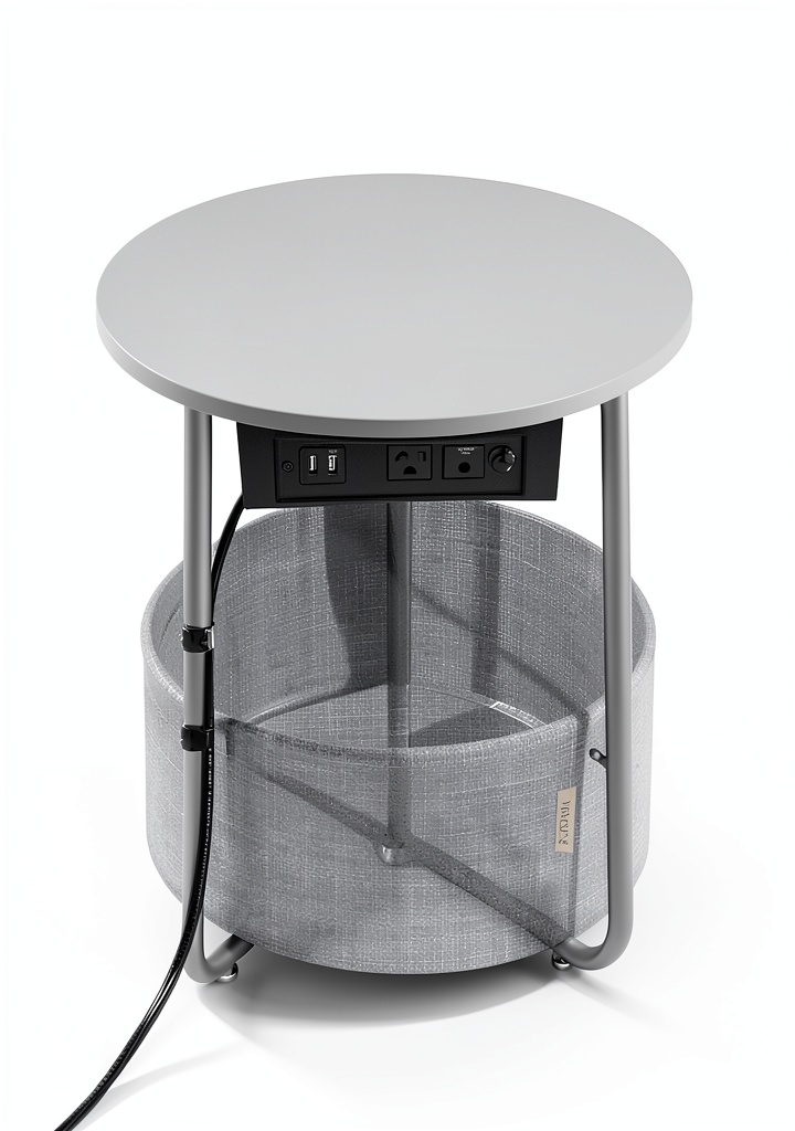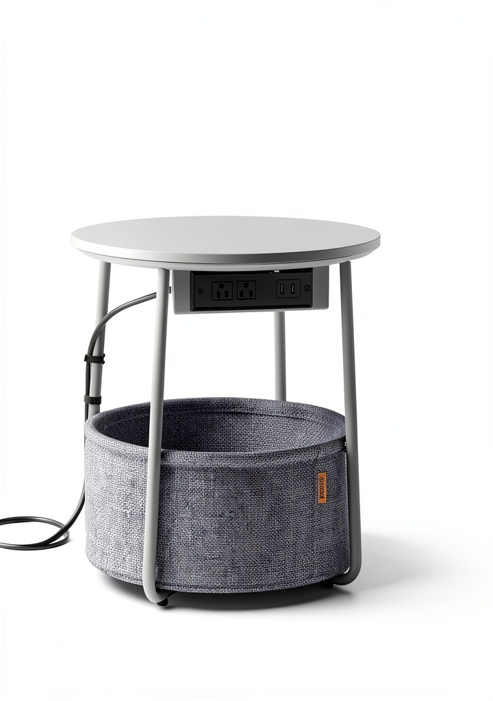 The Songmics LILEA Collection side table merges modern design with practical functionality. This round end table features a sturdy particleboard tabletop fixed to a stable frame, complemented by a double-layered polyester fabric basket for organized storage. Measuring 17.7 inches in diameter and 19.7 inches in height, it is perfectly sized for compact areas. The table includes a built-in charging station with 2 AC outlets and 2 USB ports under the top, allowing convenient device charging. Available in color options like Dove Gray and Slate Gray, Ebony Black and Slate Gray, and Matte White and Camel Brown, it suits various decor styles. Its patented design (No. USD1065896S1) emphasizes flowing curves and refined simplicity, enhancing any modern living space.