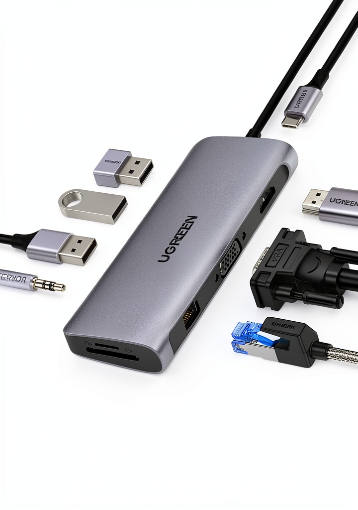 The UGREEN 10-in-1 USB-C Docking Station is engineered to expand a single USB-C port into a comprehensive connectivity hub, ideal for modern laptops. It supports dual displays via HDMI and VGA outputs, allowing extended desktops or mirrored setups for presentations and multitasking. With 100W Power Delivery pass-through charging, it keeps your laptop powered while in use, and includes three USB 3.0 ports (5Gbps), SD/TF card readers, a 3.5mm AUX audio port, and Gigabit Ethernet for stable wired networking. Crafted from durable materials with a compact design, this dock ensures reliable performance for daily use in home offices, corporate environments, and creative studios.