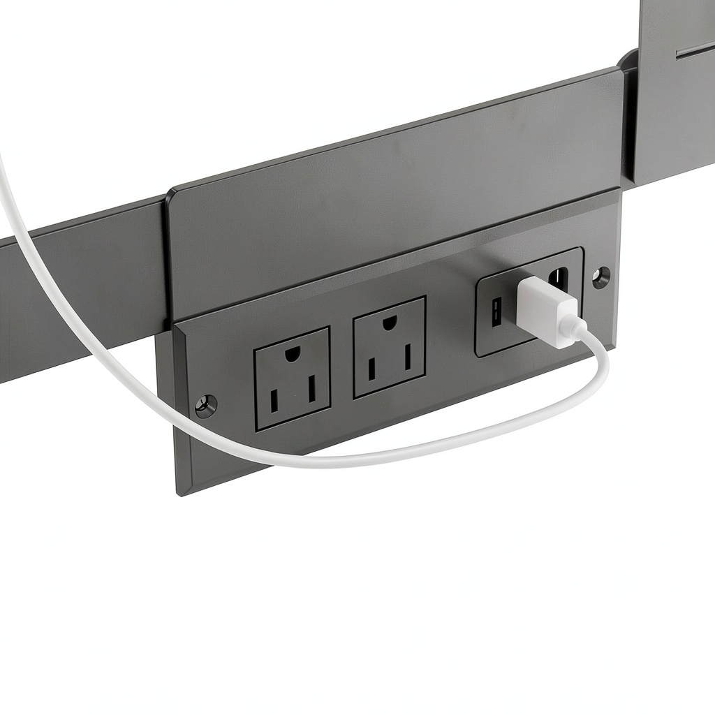- Built-in charging station with two AC outlets, two USB ports, and two Type-C ports to power multiple devices.